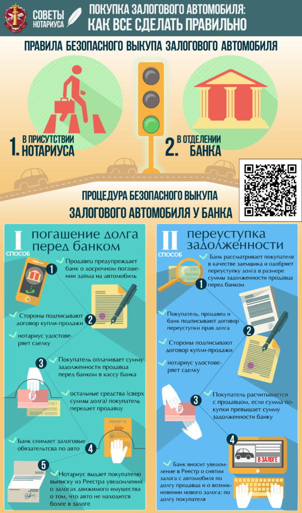 Если вы согласны на сделку, то лучше провести ее в отделении банка, в залоге у которого находится машина. В первом варианте продавец должен поставить банк в известность о том, что он собирается досрочно погасить свой кредит на автомобиль. Чтобы выкуп автомобиля был оформлен по всем правилам, желательно пригласить на сделку нотариуса. Владелец залогового авто согласует с кредитной организацией (банком) и нотариусом все вопросы, касающиеся документального оформления сделки.