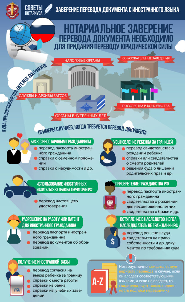 Также свидетельствование верности перевода необходимо при представлении документов: